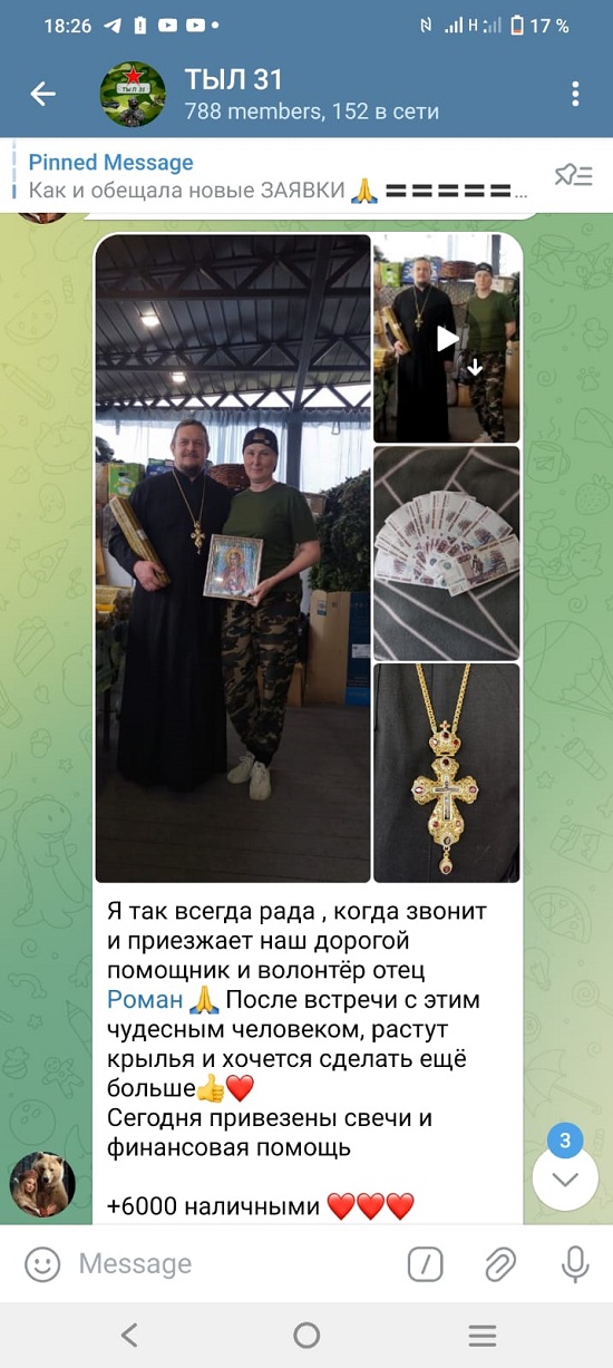 26 апреля 2024 года настоятель храма в честь святого апостола и евангелиста Иоанна Богослова с.Холодное Прохоровского р-на иерей Роман Кравченко передал в очередной раз Александре Жариковой, владельцу волонтерской группы «Тыл31», собранные продукты, вещи, деньги, окопные свечи, иконы и церковные свечи для молитвы. Александра выразила искреннюю благодарность за трехлетнее сотрудничество о. Роману и всем тем, кто принимает участие в таком благом деле.